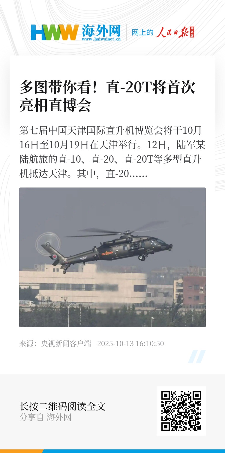 12日,陆军某陆航旅的直-10、直-20、直-20T等多型直升机抵达天津。其中,直-20T是首次参加直博会,将为观众带来飞行表演。