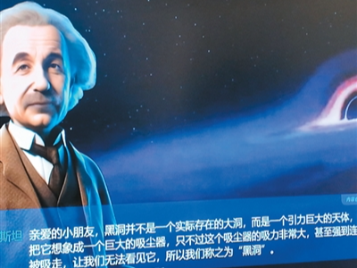基于科大讯飞联合科普中国共同研发的科普大模型,并应用虚拟人技术,讯飞星火智慧黑板“奇思妙问课堂”让张衡、爱因斯坦等古今中外名人和科学家跃然屏上,用孩子能听懂的语言回答各种天马行空的提问,且每位AI老师的回答方式都贴合个人身份,有助于激发孩子们的好奇心和探索欲。图为“爱因斯坦”和“李白”分别回答示例问题“黑洞是一个洞吗?”