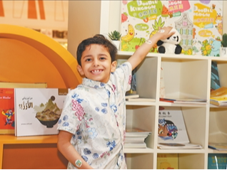 一名当地儿童在2025利雅得国际书展中国图书展区参观。