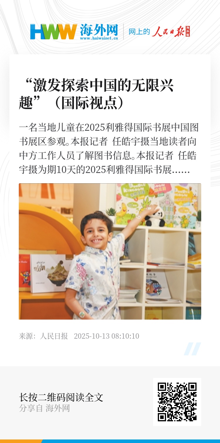 为期10天的2025利雅得国际书展10月11日在沙特阿拉伯落幕。作为阿拉伯国家影响力最大的书展之一,本届书展共吸引来自20多个国家和地区的2000多家出版商参展。书展期间,多家中国出版机构组团参展,组织开展多场文化交流活动,为中阿文明交流互鉴注入更多活力。