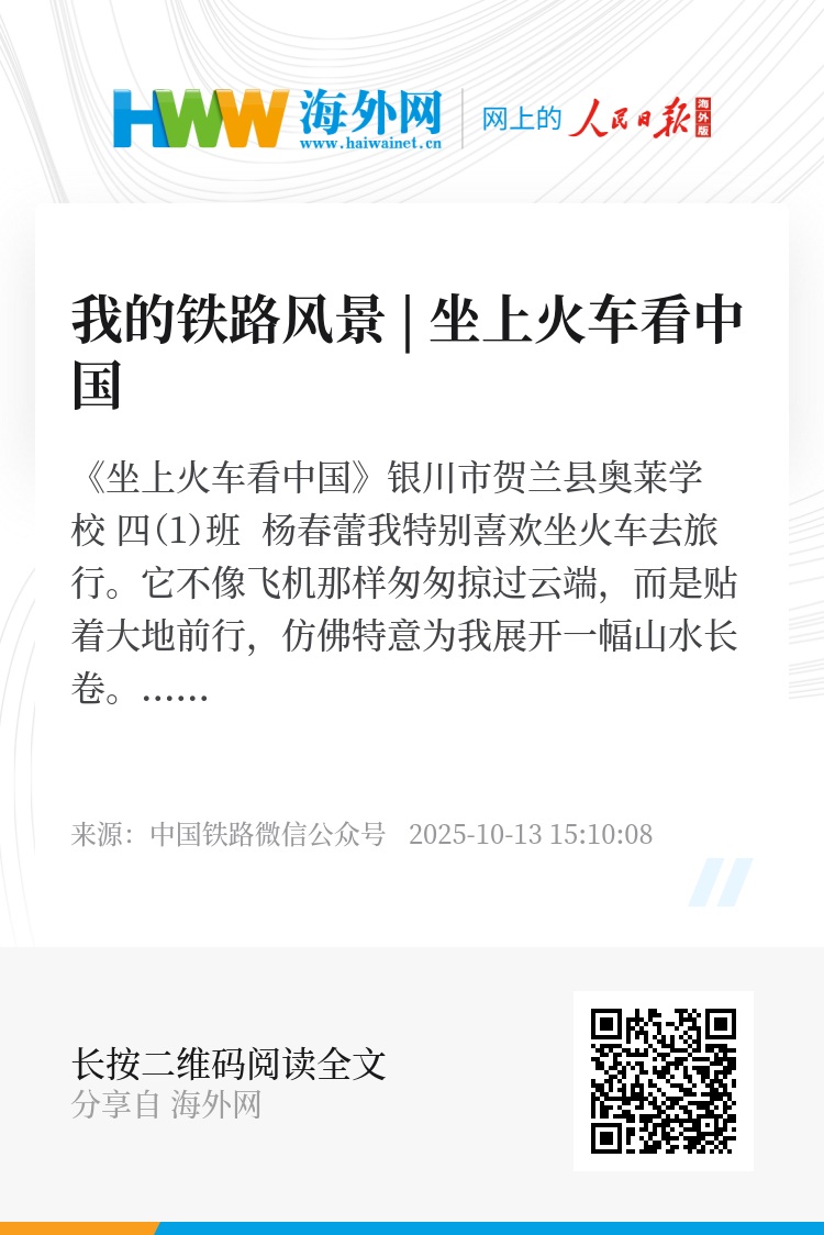 每一段钢轨都延伸着我的眼界,每一扇车窗都映照着祖国的日新月异。那些在火车上听过的故事、尝过的美食、遇见的笑脸,早已编织成我生命中的珍贵记忆。我仍记得在高铁上,一位工程师叔叔指着窗外的智能变电站,自豪地说:“现在连钢轨检修都用上机器人了!”那一刻,我触摸到了课本外真实跳动的时代脉搏。