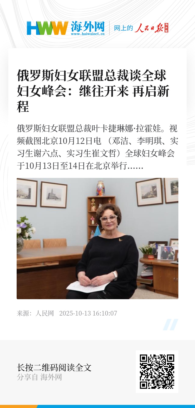 人民网北京10月12日电 (邓洁、李明琪、实习生谢六点、实习生崔文哲)全球妇女峰会于10月13日至14日在北京举行。今年是联合国第四次世界妇女大会即北京世妇会召开30周年。俄罗斯妇女联盟总裁叶卡捷琳娜·拉霍娃在接受人民网记者专访时指出,30年前的世界妇女大会为全球妇女事业产生了深远影响。今天,全球各界代表再度汇聚北京,将为世界妇女事业发展注入新动力。