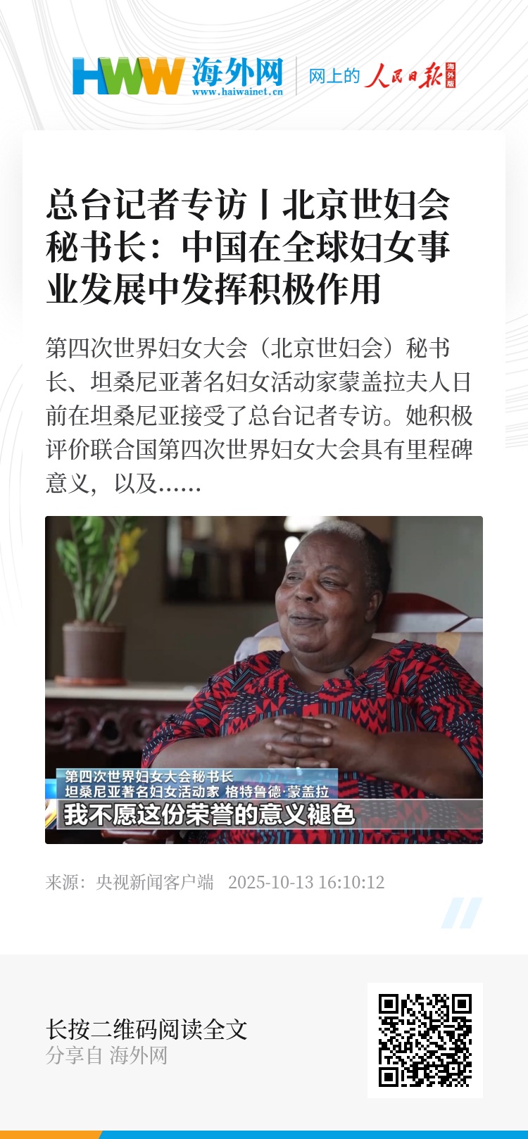 第四次世界妇女大会秘书长、坦桑尼亚著名妇女活动家 格特鲁德·蒙盖拉:北京世妇会达成的《北京宣言》和《行动纲领》,实质上为人类发展指明了正确方向。我们在庆祝北京世妇会三十周年时,既是在践行习主席的思想理念,也是在向中国人民致敬。中国政府正努力落实《北京宣言》和《行动纲领》,他们做得很好。