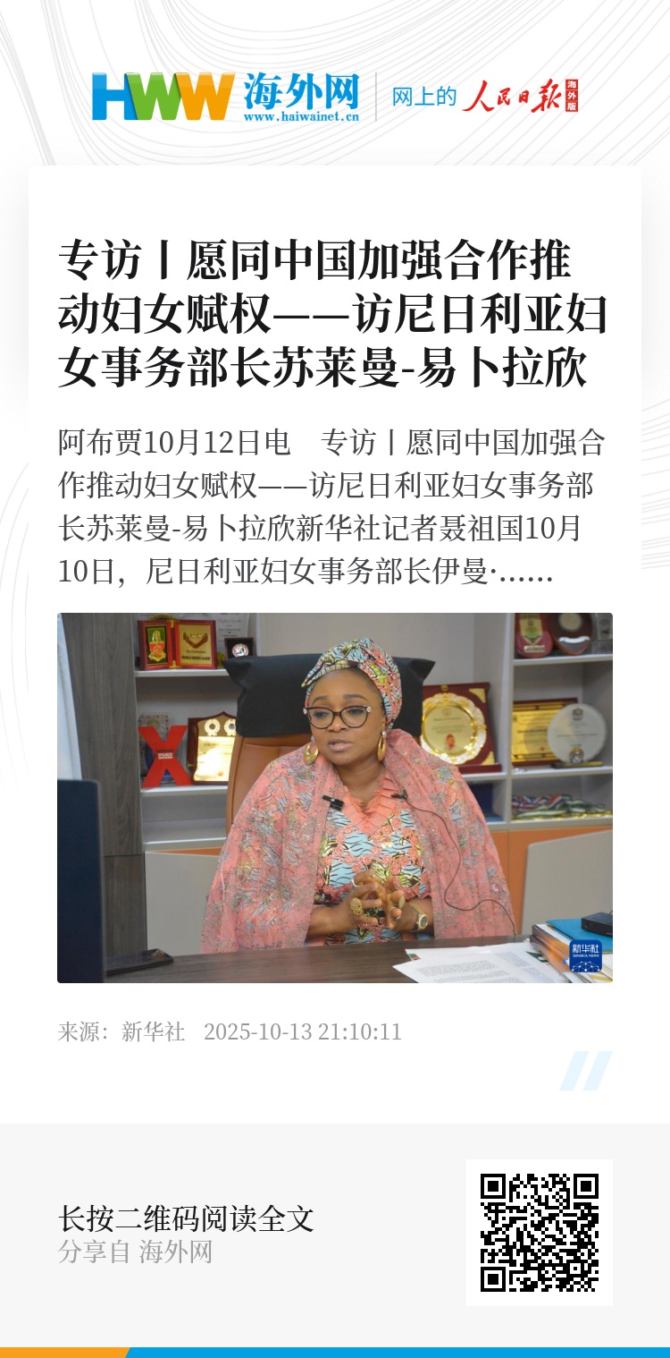 新华社阿布贾10月12日电 专访丨愿同中国加强合作推动妇女赋权——访尼日利亚妇女事务部长苏莱曼-易卜拉欣