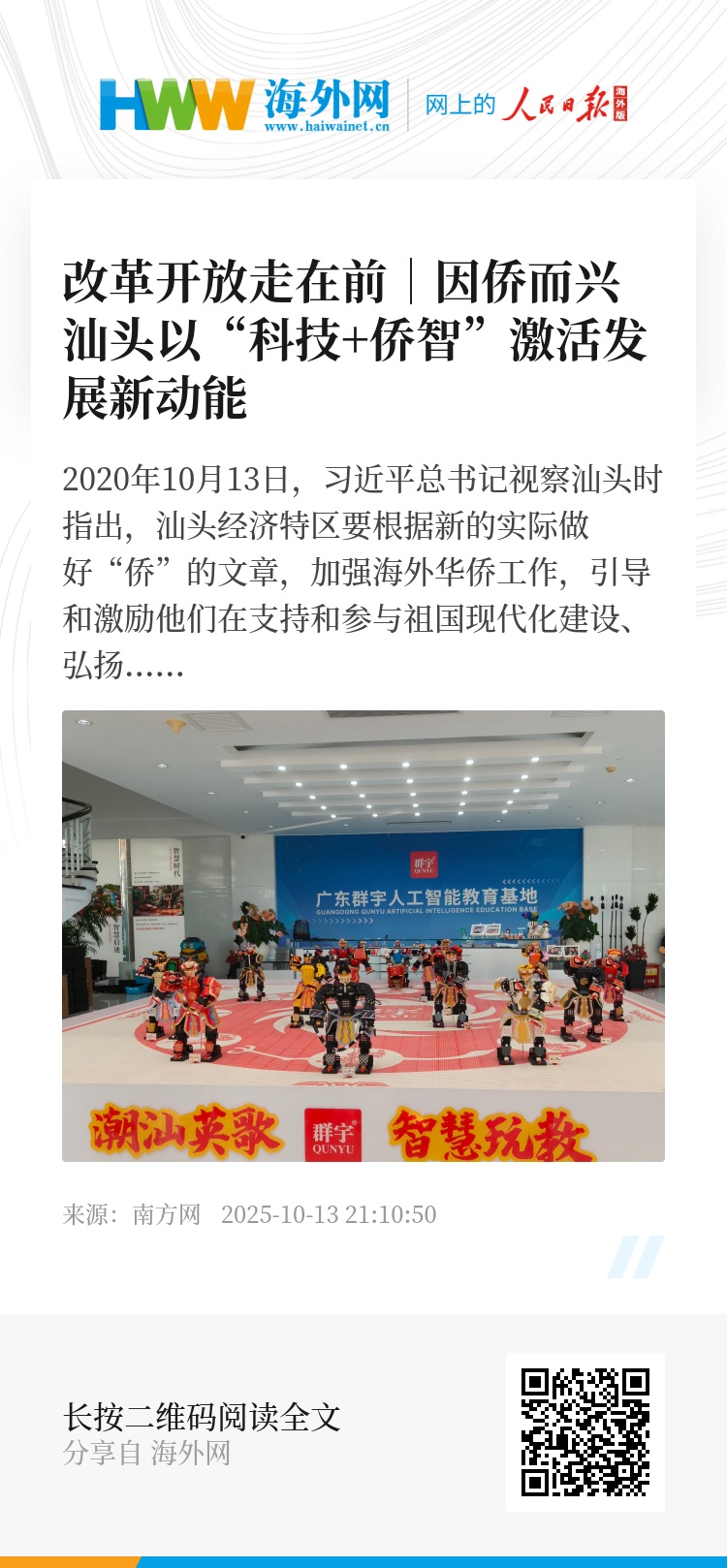 五年来,汕头牢记习近平总书记的殷殷嘱托,以“科技+侨智”双轮驱动重塑发展韧性。10月11—12日,由广东省委网信办主办、南方新闻网承办的“改革开放走在前——广东科创新气象”主题宣传活动走进汕头。采访团实地探访化学与精细化工广东省实验室、广东群宇互动科技有限公司、华侨经济文化合作试验区跨境数字经济产业园三大创新载体,解码汕头高质量发展密码。