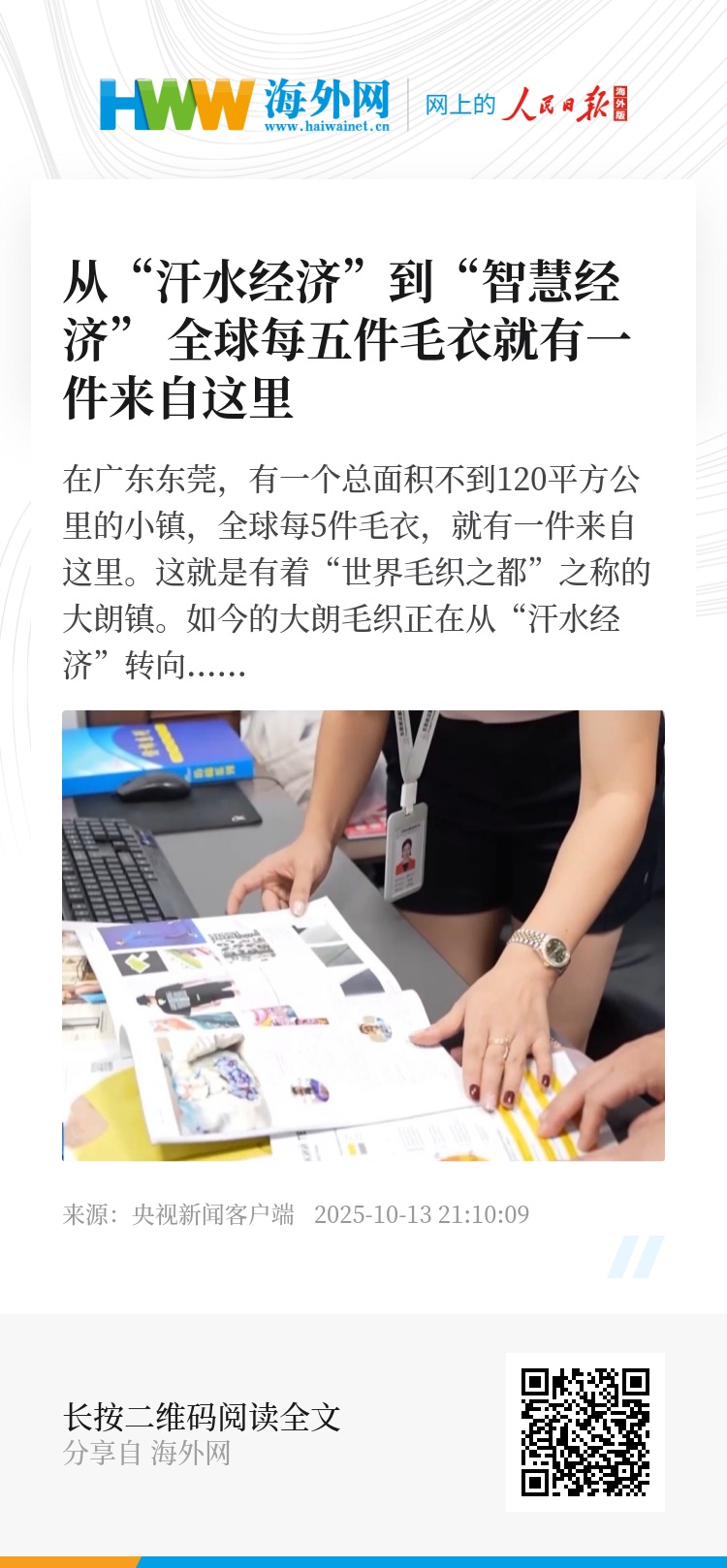 在广东东莞,有一个总面积不到120平方公里的小镇,全球每5件毛衣,就有一件来自这里。这就是有着“世界毛织之都”之称的大朗镇。如今的大朗毛织正在从“汗水经济”转向“智慧经济”,打造毛织界的“大朗速度”。