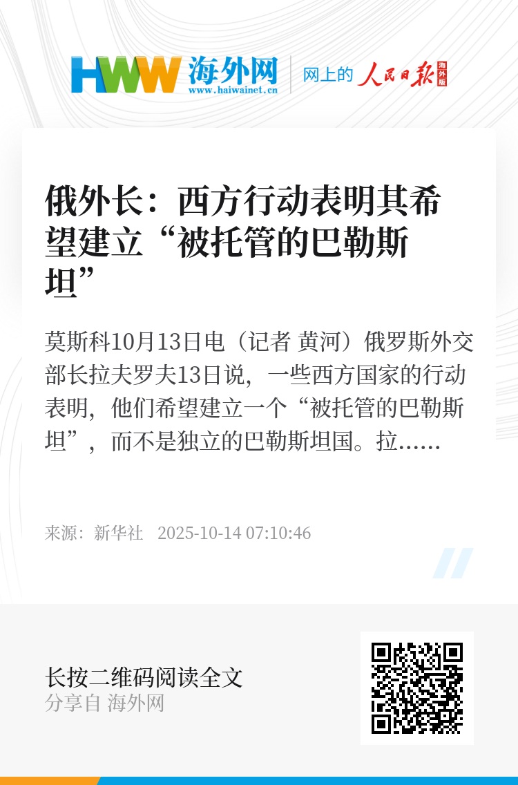 新华社莫斯科10月13日电(记者 黄河)俄罗斯外交部长拉夫罗夫13日说,一些西方国家的行动表明,他们希望建立一个“被托管的巴勒斯坦”,而不是独立的巴勒斯坦国。