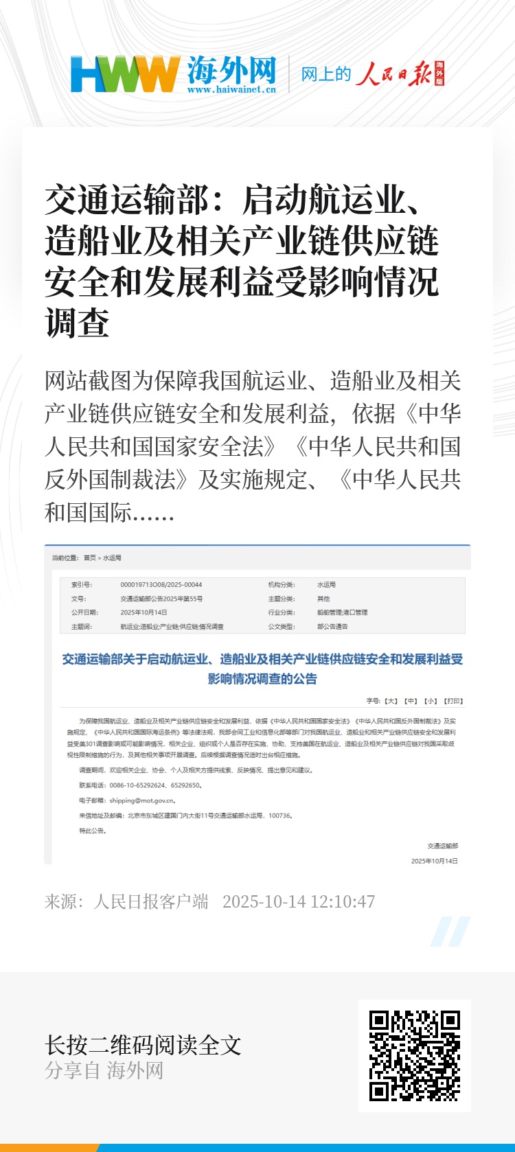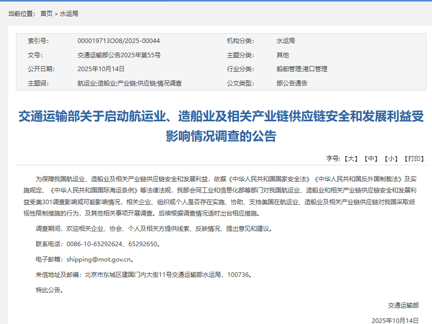为保障我国航运业、造船业及相关产业链供应链安全和发展利益,依据《中华人民共和国国家安全法》《中华人民共和国反外国制裁法》及实施规定、《中华人民共和国国际海运条例》等法律法规,我部会同工业和信息化部等部门对我国航运业、造船业和相关产业链供应链安全和发展利益受美301调查影响或可能影响情况,相关企业、组织或个人是否存在实施、协助、支持美国在航运业、造船业及相关产业链供应链对我国采取歧视性限制措施的行为,及其他相关事项开展调查。后续根据调查情况适时出台相应措施。
