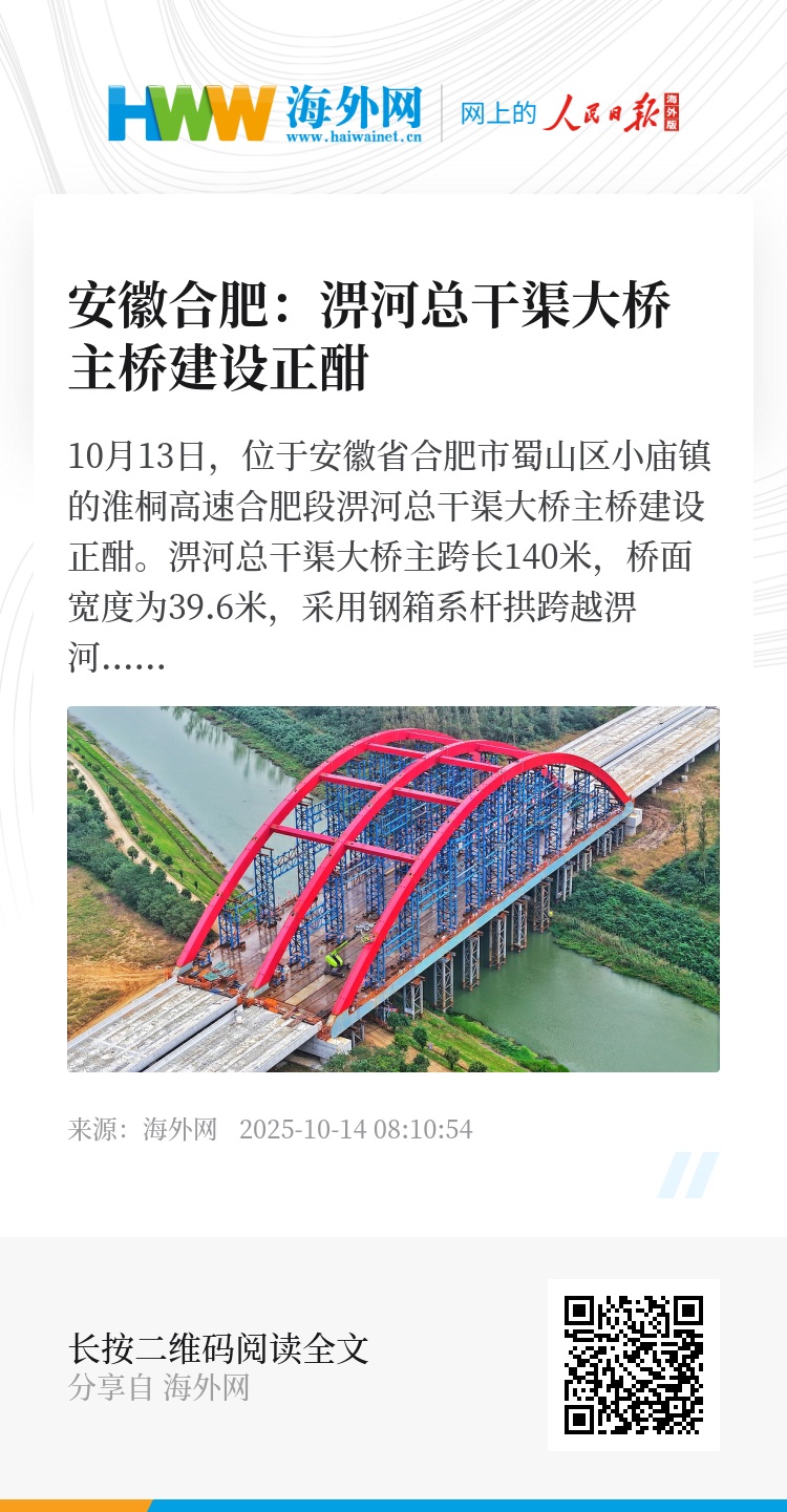 10月13日,位于安徽省合肥市蜀山区小庙镇的淮桐高速合肥段淠河总干渠大桥主桥建设正酣。淠河总干渠大桥主跨长140米,桥面宽度为39.6米,采用钢箱系杆拱跨越淠河总干渠,拱肋矢高达30米,是淮桐高速合肥段-2标的关键控制性节点工程。(图源:视觉中国)