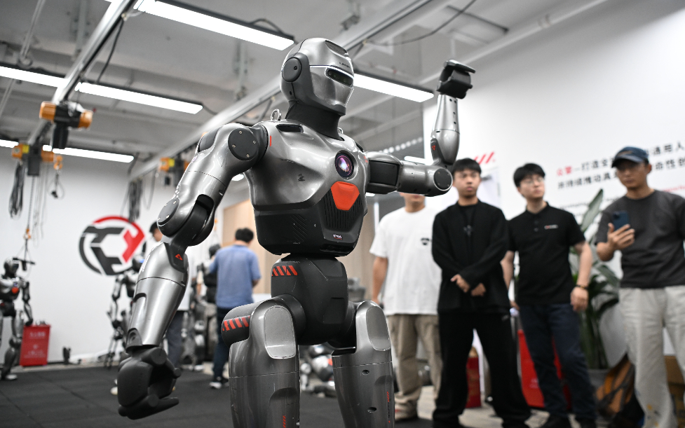 6月25日,在深圳市众擎机器人科技有限公司,人形机器人挥舞手臂致意。新华社记者 邓华 摄