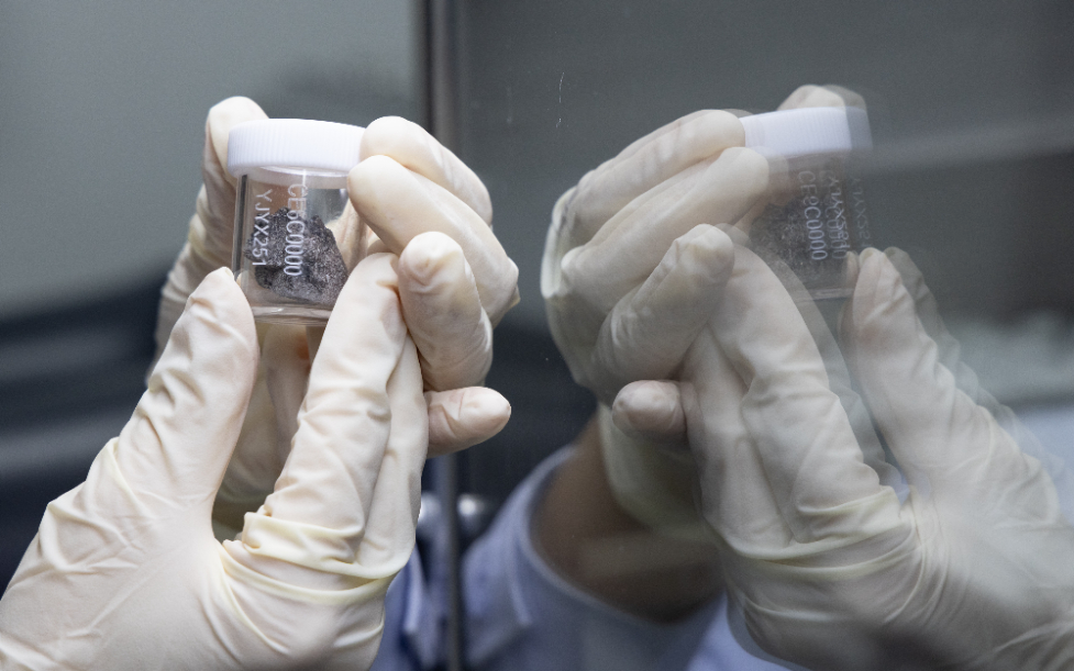 科研人员在月球样品实验室展示嫦娥六号月球样品。新华社记者 金立旺 摄