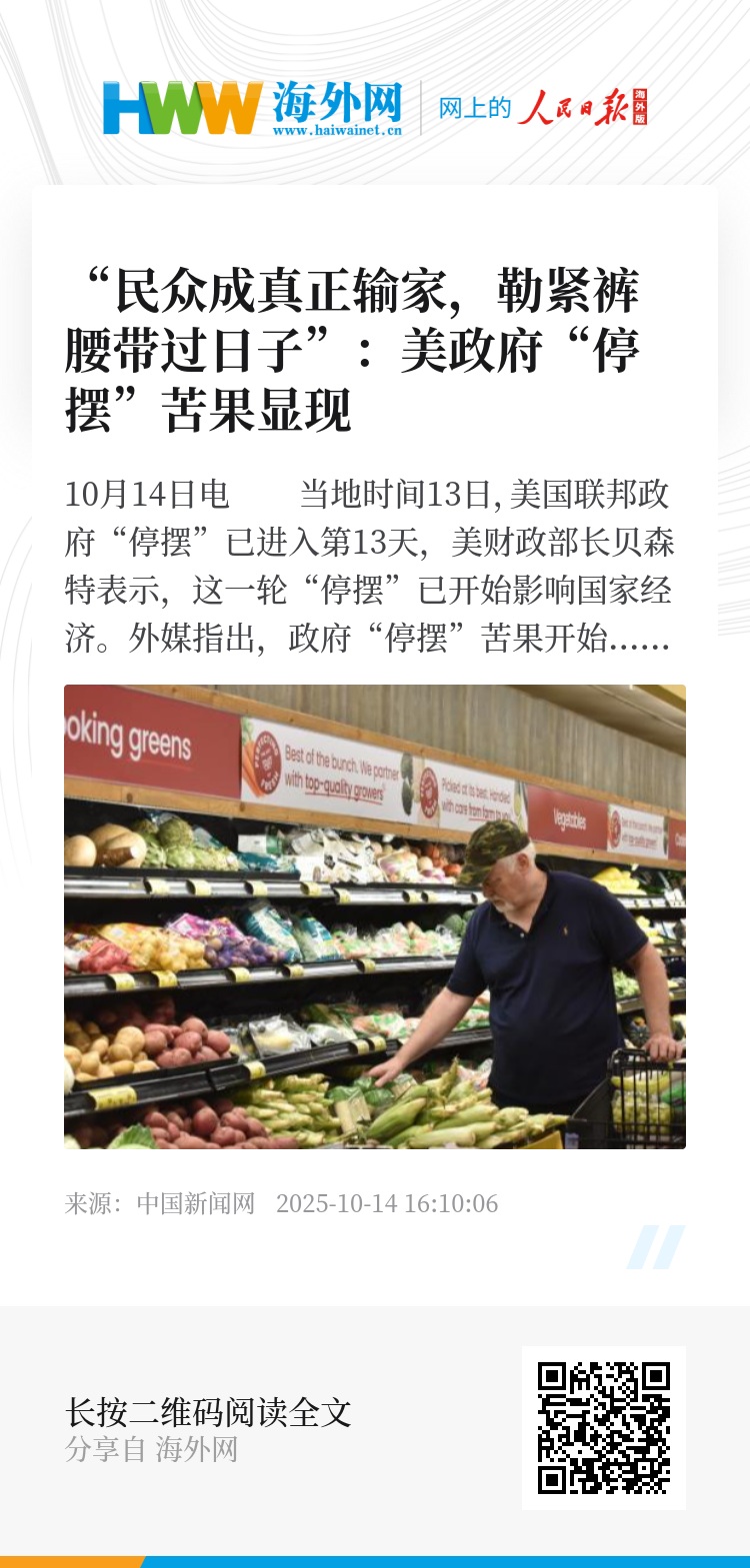 中新网10月14日电 当地时间13日,美国联邦政府“停摆”已进入第13天,美财政部长贝森特表示,这一轮“停摆”已开始影响国家经济。外媒指出,政府“停摆”苦果开始真正显现,在两党持续博弈的情况下,美国民众成为真正的输家。