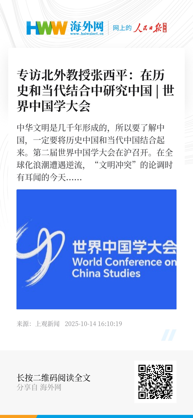 第二届世界中国学大会在沪召开。在全球化浪潮遭遇逆流,“文明冲突”的论调时有耳闻的今天,我们应当如何定位中国?中华文化如何创新性地“走出去”?