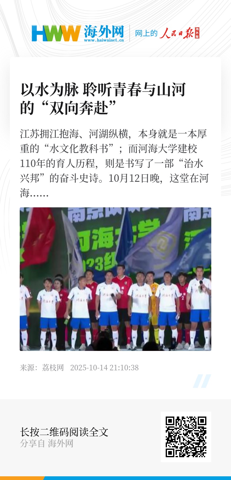 江苏拥江抱海、河湖纵横,本身就是一本厚重的“水文化教科书”;而河海大学建校110年的育人历程,则是书写了一部“治水兴邦”的奋斗史诗。10月12日晚,这堂在河海大学举行的大思政课,用一个个现实场景触摸潺潺水脉,用一个个奋斗故事串联家国记忆,激励广大青年学子在共情与共鸣中坚定理想信念,在触动和感动中锤炼过硬本领。