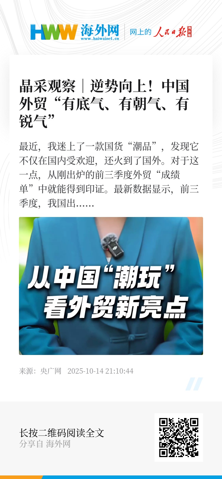 总体来看,我国外贸在风雨中砥砺前行。前三季度,国内存量与增量政策持续发力、成效显现,不仅韧性彰显、结构持续优化,更实现了量质齐升,这一成绩来之不易。我国作为维护全球产业链供应链稳定畅通的重要力量,正为全球经济的稳定与发展持续贡献着坚实的中国力量。