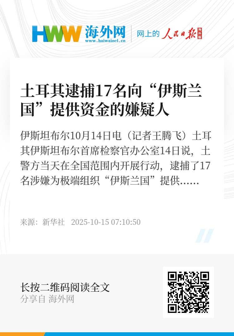 新华社伊斯坦布尔10月14日电(记者王腾飞)土耳其伊斯坦布尔首席检察官办公室14日说,土警方当天在全国范围内开展行动,逮捕了17名涉嫌为极端组织“伊斯兰国”提供资金支持的嫌疑人。
