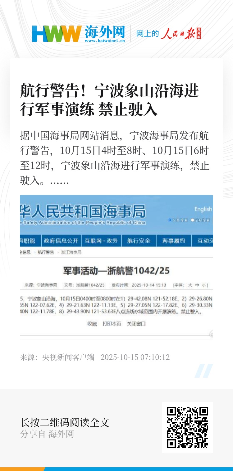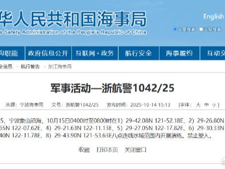 据中国海事局网站消息,宁波海事局发布航行警告,10月15日4时至8时、10月15日6时至12时,宁波象山沿海进行军事演练,禁止驶入。