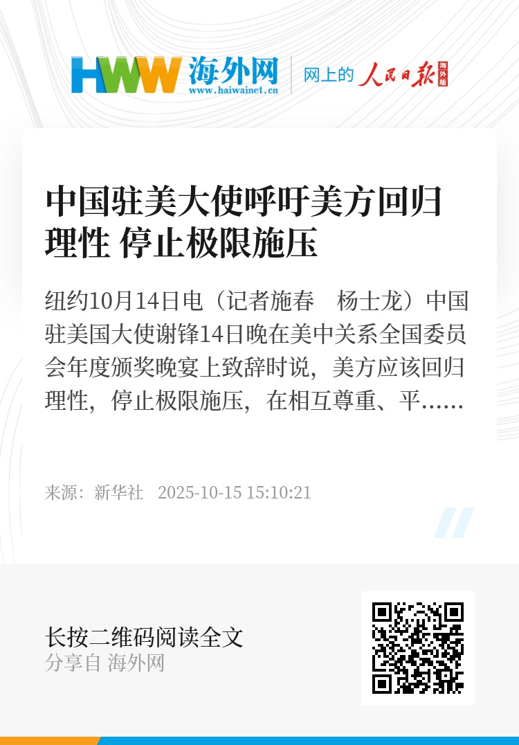 新华社纽约10月14日电(记者施春 杨士龙)中国驻美国大使谢锋14日晚在美中关系全国委员会年度颁奖晚宴上致辞时说,美方应该回归理性,停止极限施压,在相互尊重、平等协商基础上,通过对话解决各自关切,不要再走经贸关系紧张升级的老路死路。