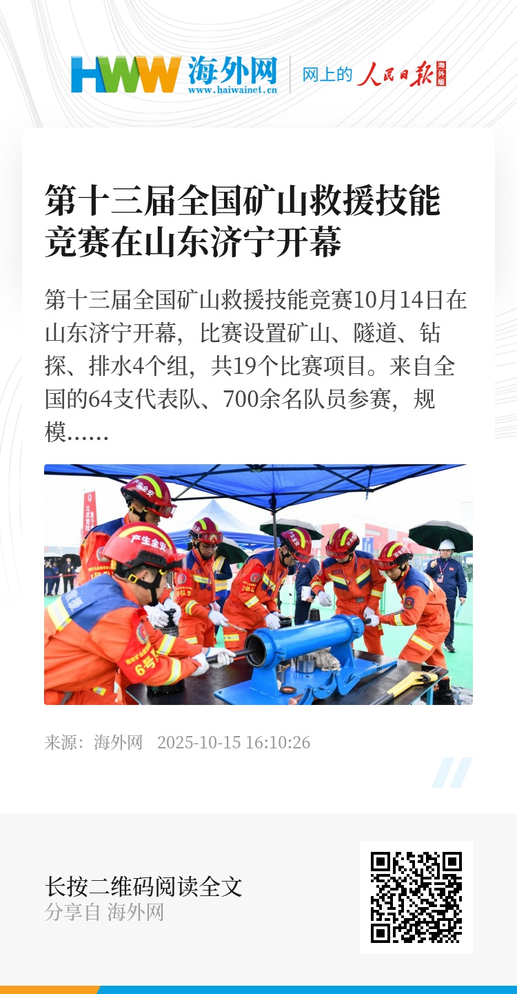 第十三届全国矿山救援技能竞赛10月14日在山东济宁开幕,比赛设置矿山、隧道、钻探、排水4个组,共19个比赛项目。来自全国的64支代表队、700余名队员参赛,规模创历届之最。中新社记者 沙见龙 摄 图源:视觉中国