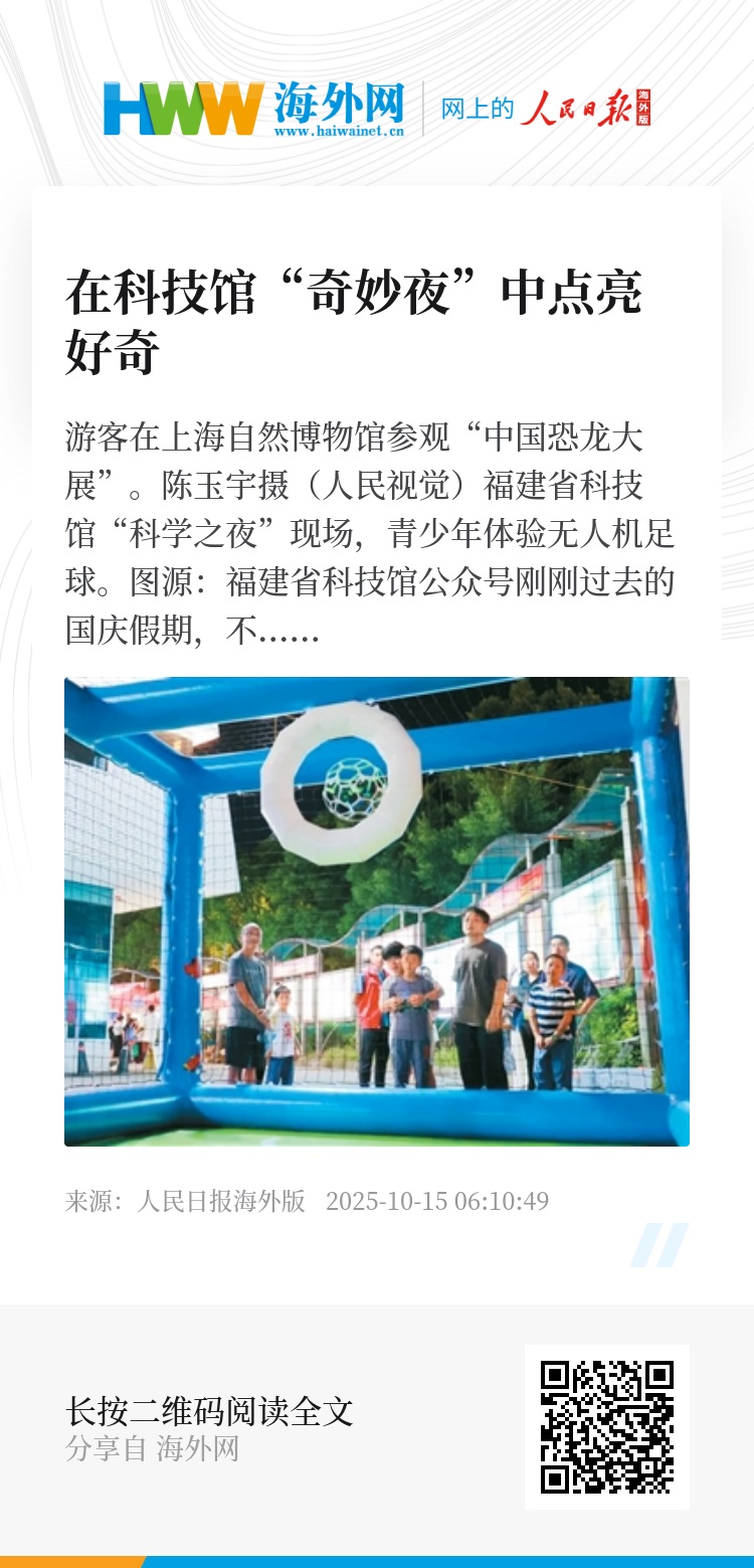 国庆假期里,福建省科技馆推出“科学之夜”活动,无人机灯光秀点亮夜空,天文望远镜现场观测星空,“科学集市”在灯光映照下别具韵味……6大板块30余项科普活动吸引了数千人参与。科技馆延时开放在满足市民夜间参观需求的同时,也推动了科普教育与城市夜间文化生活巧妙融合。