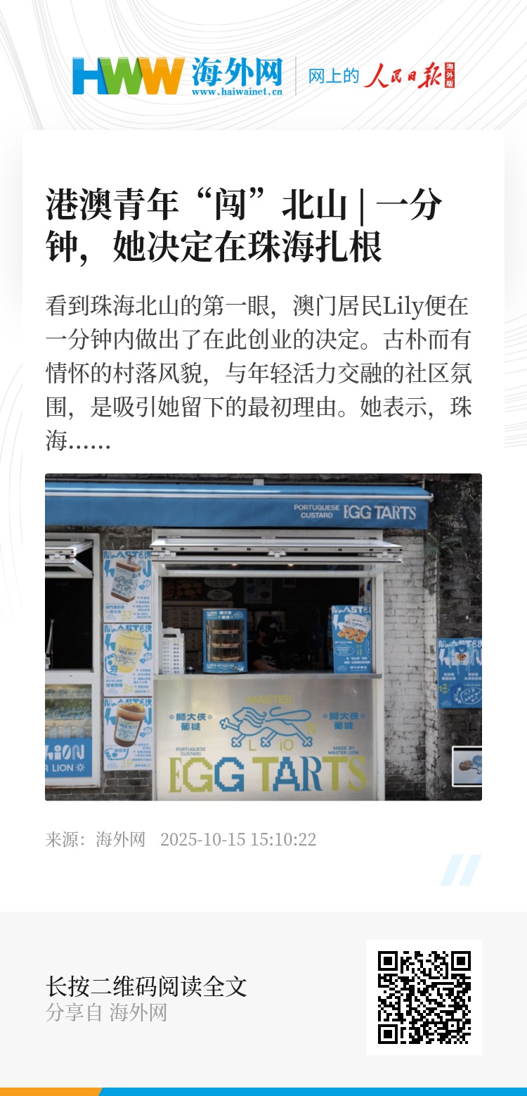 如今,越来越多港澳青年像莉莉一样,选择来珠海兴业。莉莉也期待能与更多伙伴共同努力,把北山建设得更好,助力湾区融合发展。10月16日,第六届海外华文新媒体论坛举行,百位海外华文媒体领袖将齐聚珠海,将更多港澳青年的创业故事讲给世界听。