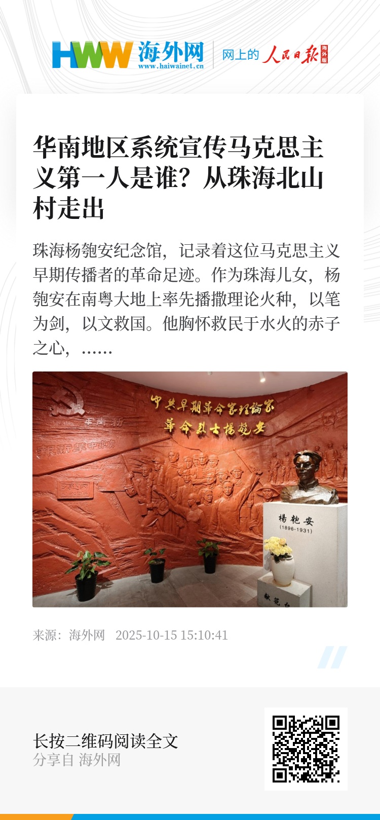 珠海杨匏安纪念馆,记录着这位马克思主义早期传播者的革命足迹。作为珠海儿女,杨匏安在南粤大地上率先播撒理论火种,以笔为剑,以文救国。他胸怀救民于水火的赤子之心,其清贫自守、坚贞不屈的气节,正是这座城市红色基因的生动注脚。