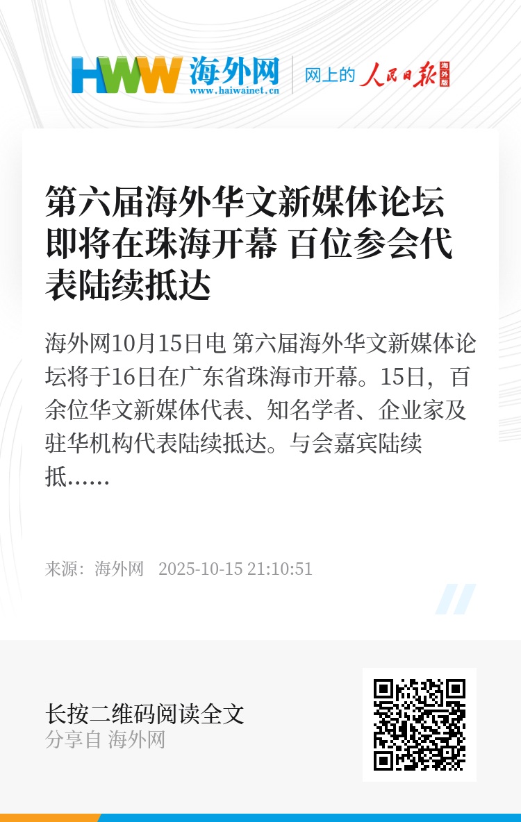海外网10月15日电 第六届海外华文新媒体论坛将于16日在广东省珠海市开幕。15日,百余位华文新媒体代表、知名学者、企业家及驻华机构代表陆续抵达。