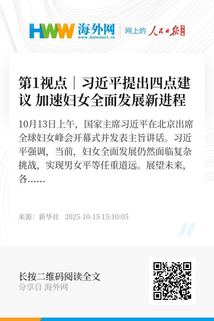 习近平强调,当前,妇女全面发展仍然面临复杂挑战,实现男女平等任重道远。展望未来,各方要重温北京世妇会初心,为加速妇女全面发展新进程凝聚更广泛共识、开辟更广阔道路、采取更务实行动。习近平提出四点建议。