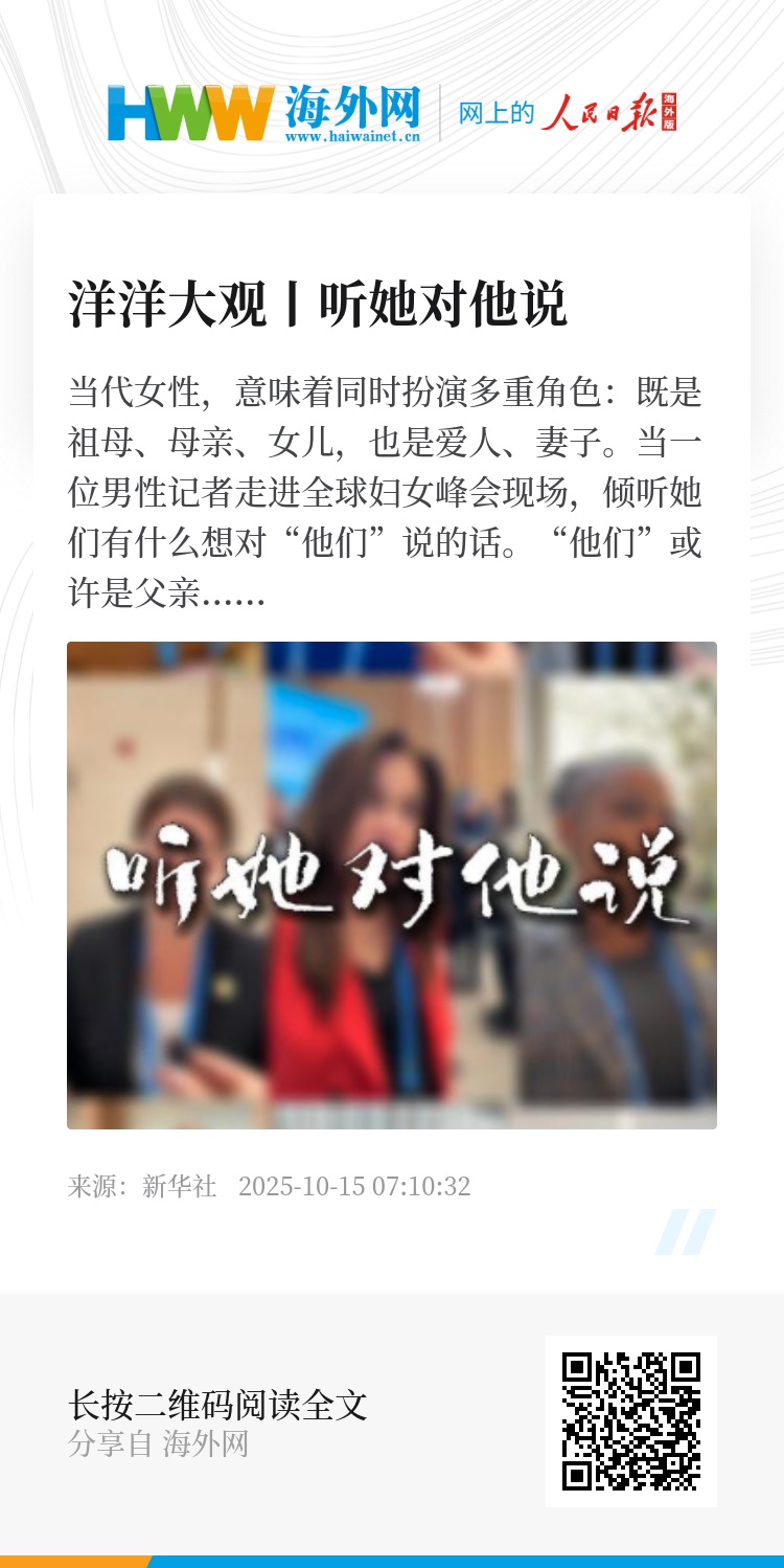 当代女性,意味着同时扮演多重角色:既是祖母、母亲、女儿,也是爱人、妻子。当一位男性记者走进全球妇女峰会现场,倾听她们有什么想对“他们”说的话。“他们”或许是父亲,是丈夫,是儿子,也有可能就是屏幕前世界各地的“他”。(记者/视频:邵黛琳、胡大韋(报道员))
