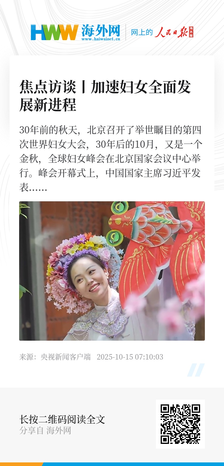 “行之苟有恒,久久自芬芳。”30年前,北京世妇会以《北京宣言》点亮全球妇女事业的前行之路。30年里,从让6.9亿多妇女同步迈入全面小康,到“妇幼健康工程”“春蕾计划”“母亲水窖”等民生项目或模式从中国走向世界,中国始终以知行合一的担当,推动着全球男女平等和妇女全面发展。未来,我们也将继续携手各国传承弘扬北京世妇会精神,打破偏见壁垒、共破发展难题,让每一位女性都能在时代浪潮中绽放光彩,共建共享一个对所有妇女、对所有人更加美好的世界。