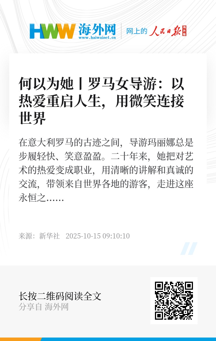 在意大利罗马的古迹之间,导游玛丽娜总是步履轻快、笑意盈盈。二十年来,她把对艺术的热爱变成职业,用清晰的讲解和真诚的交流,带领来自世界各地的游客,走进这座永恒之城的文明长廊。