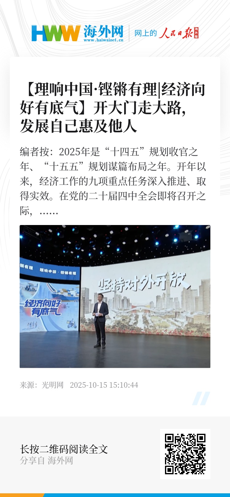 现在,我们可以做一个总结,对外开放不仅让我们的生活更加多彩,也为国家带来了前所未有的发展机遇。所以,开放不是一时的选择,而是长远发展的必然路径;它不仅是经济的引擎,更是文明互鉴、共创未来的桥梁。唯有坚持打开大门,与世界共享机遇,中国才能在时代的浪潮中行稳致远,书写更加辉煌的篇章。
