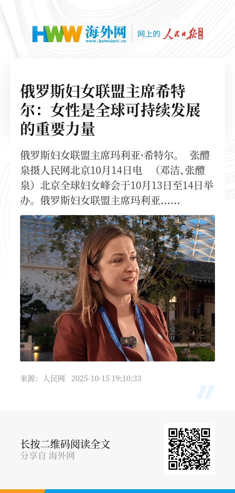 人民网北京10月14日电 (邓洁、张醴泉)北京全球妇女峰会于10月13日至14日举办。俄罗斯妇女联盟主席玛利亚·希特尔在接受人民网专访时指出,推动女性事业发展,对实现全球可持续发展具有关键意义。
