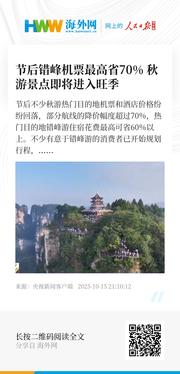 节后不少秋游热门目的地机票和酒店价格纷纷回落,部分航线的降价幅度超过70%,热门目的地错峰游住宿花费最高可省60%以上。不少有意于错峰游的消费者已开始规划行程,“抄底”节后机票、酒店等旅游产品。