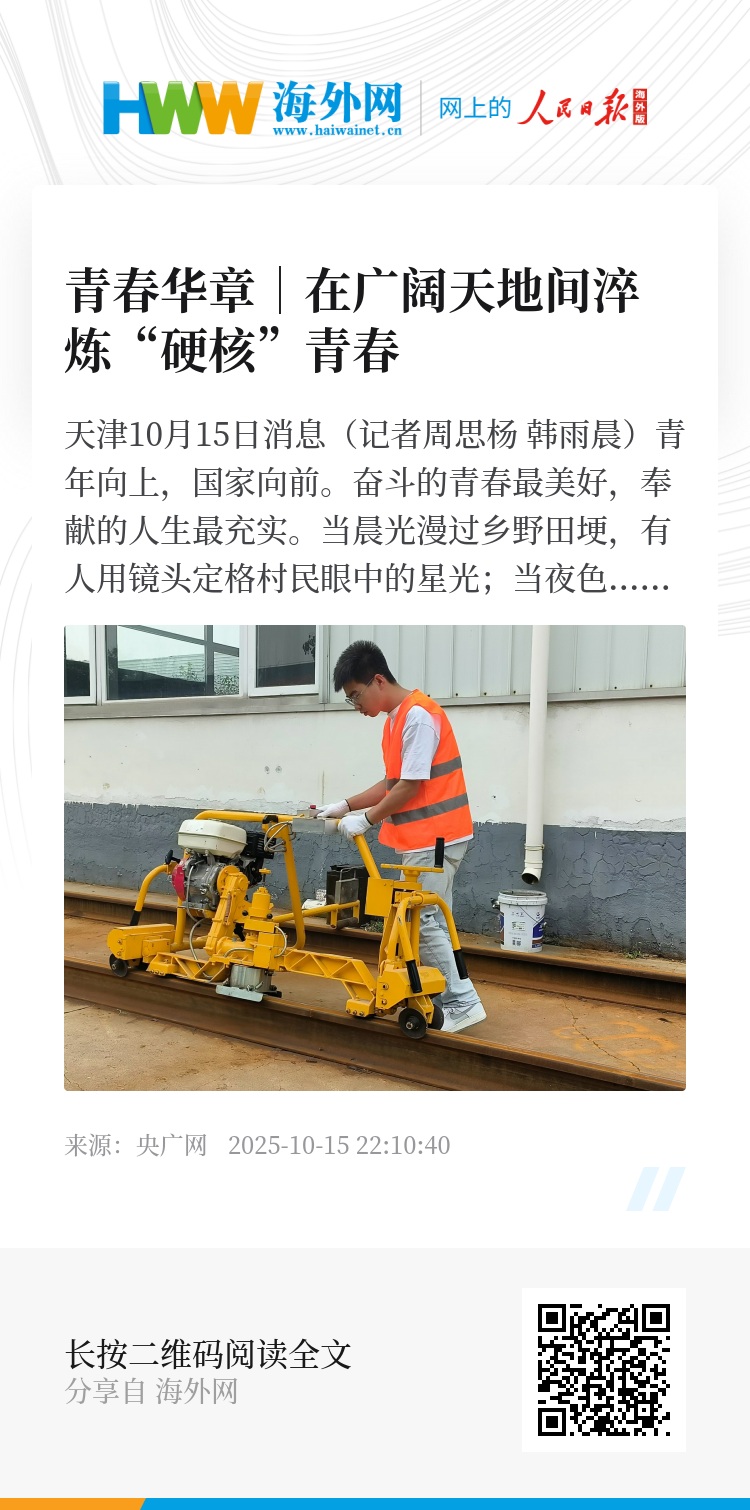 央广网天津10月15日消息(记者周思杨 韩雨晨)青年向上,国家向前。奋斗的青春最美好,奉献的人生最充实。当晨光漫过乡野田埂,有人用镜头定格村民眼中的星光;当夜色点亮实验室灯盏,有人在电路板上追逐工业精度的极致;当钢轨延伸向远方天际,有人以匠心校准每一寸安全刻度——新时代的青年学子中,正涌现出这样一批“追光者”:他们以专业为笔、以奋斗为墨,把个人理想融入乡村振兴、制造强国、交通强国的时代画卷,让青春风采在服务祖国、奉献社会的实践中熠熠生辉。