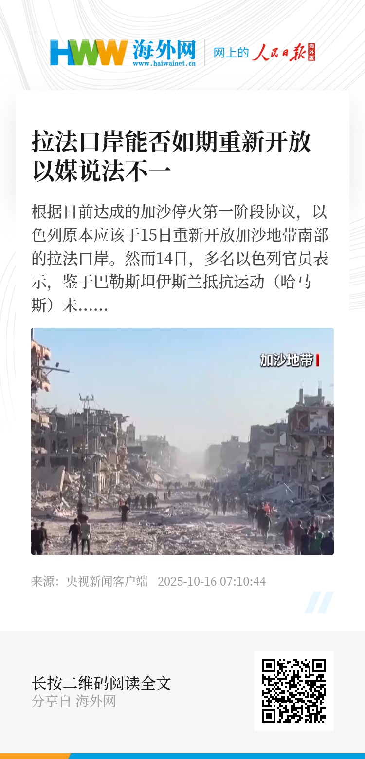 据多家以色列媒体14日援引以方官员的话说,以色列政府以哈马斯未能按时移交所有被扣押人员遗体为由,决定暂停拉法口岸的重新开放。15日,以色列公共广播公司一度报道称,鉴于哈马斯14日夜间向以方移交了部分被扣押人员遗体,并计划移交更多遗体,以色列方面决定按原计划于当天重新开放拉法口岸。但稍晚时,《以色列时报》又援引以色列安全部门官员的话说,拉法口岸15日不会开放。