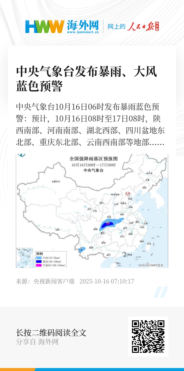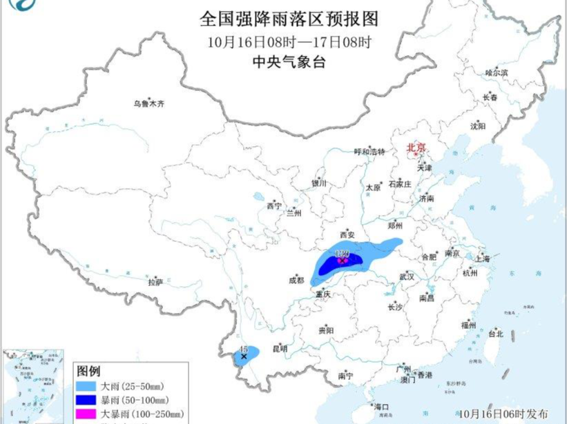 中央气象台10月16日06时发布暴雨蓝色预警:预计,10月16日08时至17日08时,陕西南部、河南南部、湖北西部、四川盆地东北部、重庆东北部、云南西南部等地部分地区有大到暴雨,其中,陕西东南部、湖北西北部、四川盆地东北部、重庆东北部等地部分地区有大暴雨(100~120毫米)。上述部分地区伴有短时强降水(最大小时降雨量20~40毫米,局地可超过50毫米)。