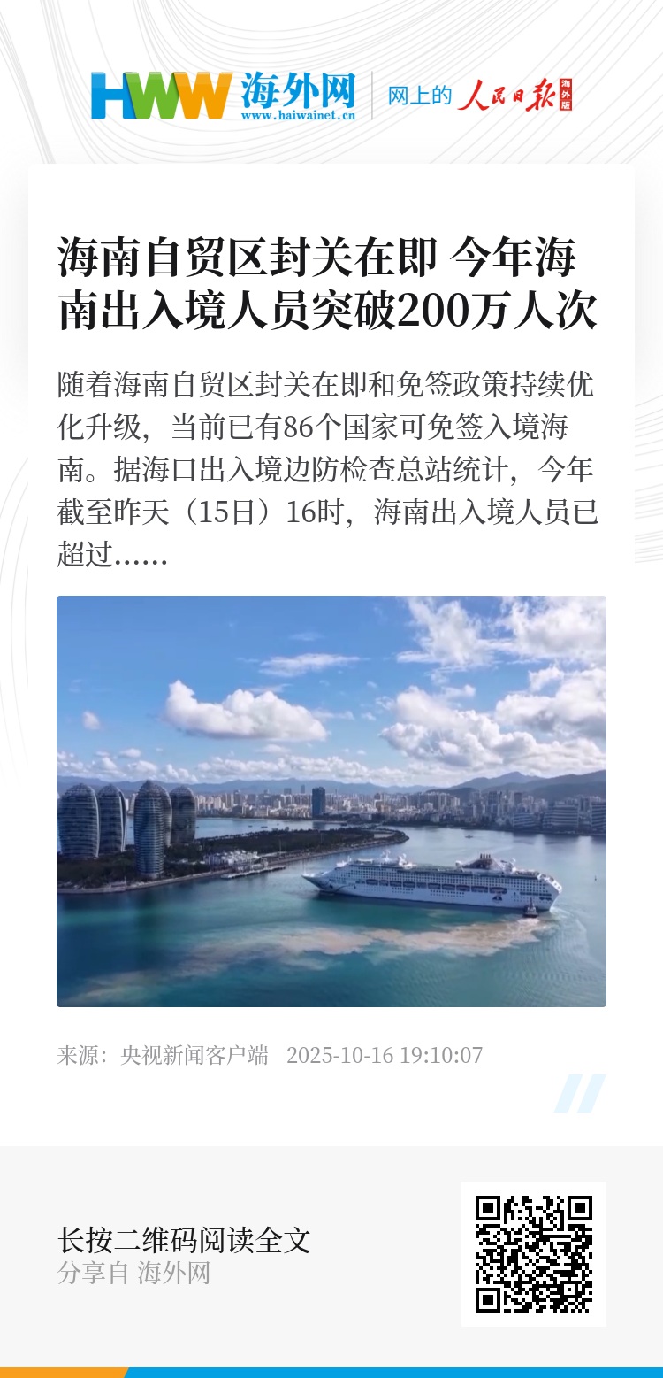 随着海南自贸区封关在即和免签政策持续优化升级,当前已有86个国家可免签入境海南。据海口出入境边防检查总站统计,今年截至昨天(15日)16时,海南出入境人员已超过200万人次,同比增长22.4%。
