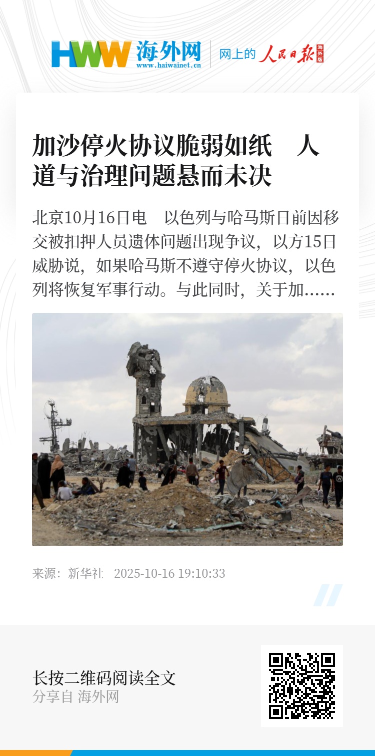 新华社北京10月16日电 以色列与哈马斯日前因移交被扣押人员遗体问题出现争议,以方15日威胁说,如果哈马斯不遵守停火协议,以色列将恢复军事行动。与此同时,关于加沙人道危机以及未来治理问题仍然面临挑战。