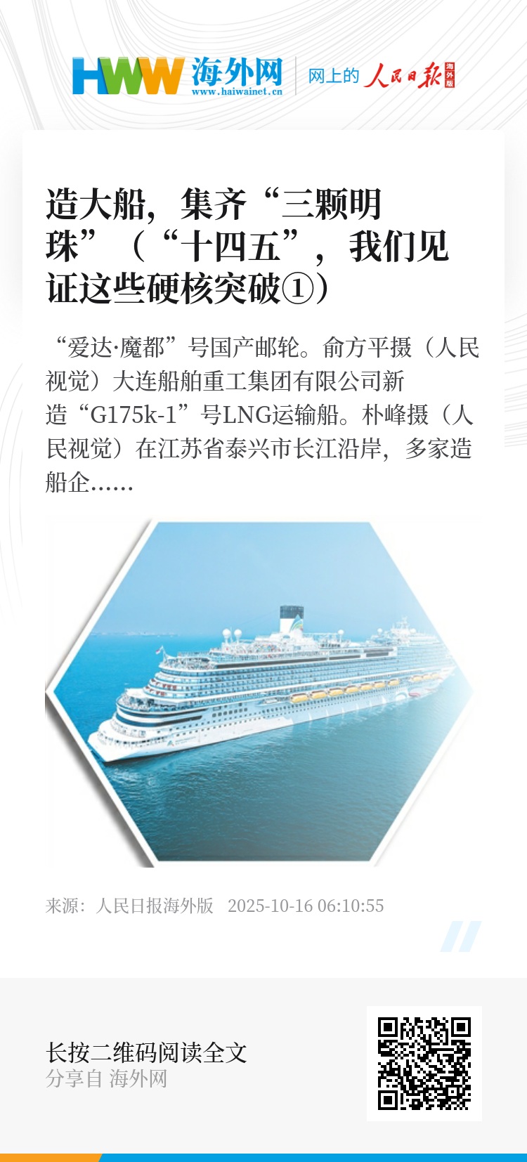 第一艘国产电磁弹射航母福建舰下水、第一艘国产大型邮轮“爱达·魔都号”建成运营、大型液化天然气(LNG)运输船全球领先……“十四五”期间,中国成为全球唯一同时拥有三大顶级船型完整建造能力的国家。这不仅是吨位上的突破,更是中国造船工业的历史性跨越。