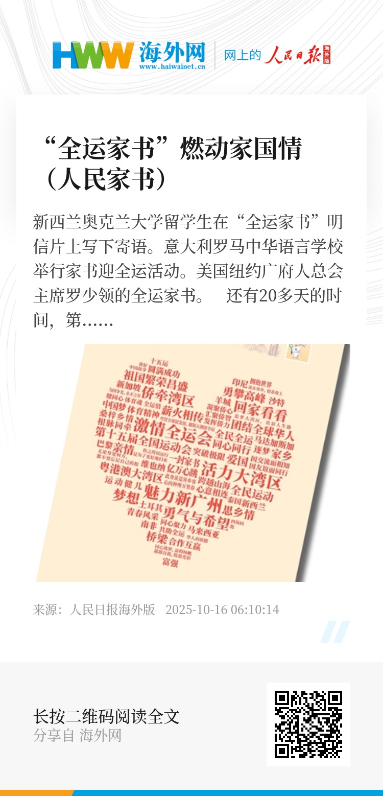 罗马中华语言学校校长蒋忠华认为,十五运会不只是体育竞技的舞台,更是弘扬中华文化的重要窗口,与学校传播中华文化的使命高度契合。“我们深信,语言是文化的载体,文化是语言的灵魂。希望通过‘全运家书’这样的文化活动,让海外华裔青少年在潜移默化中接受中华文化熏陶,让文化的血脉代代相传。”(本报记者 刘峣)