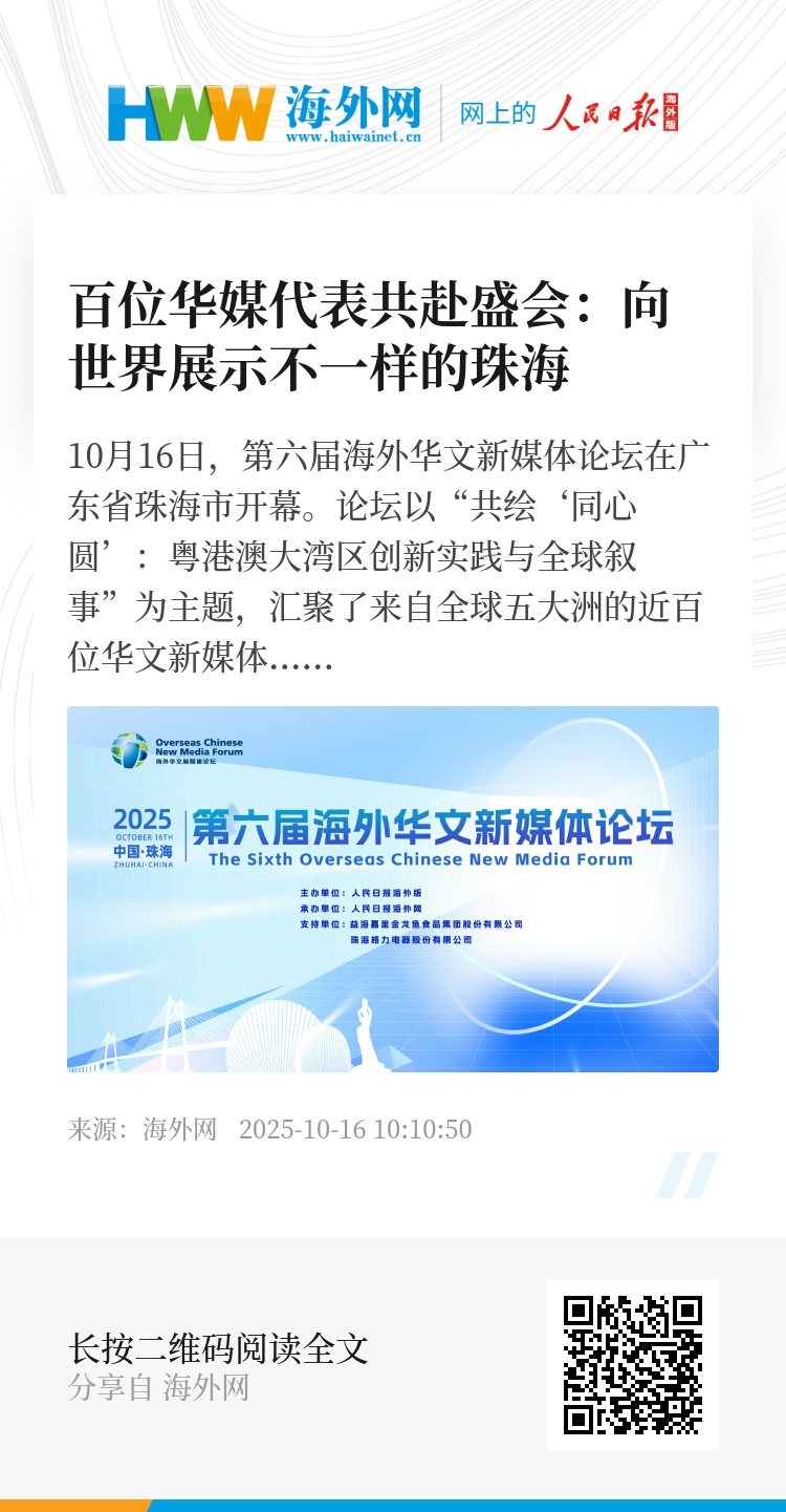 10月16日,第六届海外华文新媒体论坛在广东省珠海市开幕。论坛以“共绘‘同心圆’:粤港澳大湾区创新实践与全球叙事”为主题,汇聚了来自全球五大洲的近百位华文新媒体代表、知名学者、企业家及驻华机构代表,共同探讨在全球传播新格局下,如何讲好粤港澳大湾区故事,传递中国发展强音。