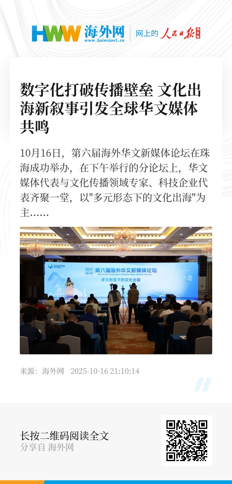 海外网10月16日电 10月16日,第六届海外华文新媒体论坛在珠海成功举办,在下午举行的分论坛上,华文媒体代表与文化传播领域专家、科技企业代表齐聚一堂,以"多元形态下的文化出海"为主题,共同探讨新时代中华文化走向世界的创新路径与发展机遇。