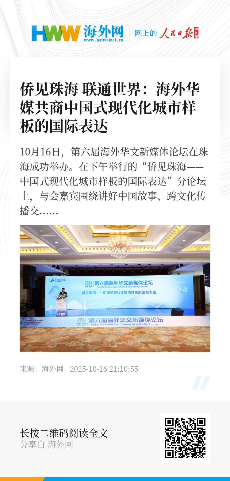 海外网10月16日电 10月16日,第六届海外华文新媒体论坛在珠海成功举办。在下午举行的“侨见珠海——中国式现代化城市样板的国际表达”分论坛上,与会嘉宾围绕讲好中国故事、跨文化传播交流等议题展开深入探讨,共同为提升国际传播效能,推动中国城市更好走向世界贡献智慧。