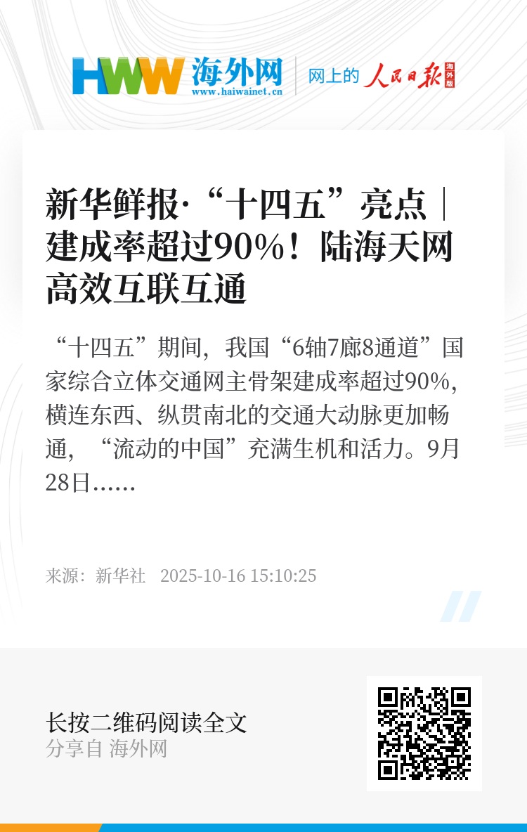 “十四五”期间,我国“6轴7廊8通道”国家综合立体交通网主骨架建成率超过90%,横连东西、纵贯南北的交通大动脉更加畅通,“流动的中国”充满生机和活力。