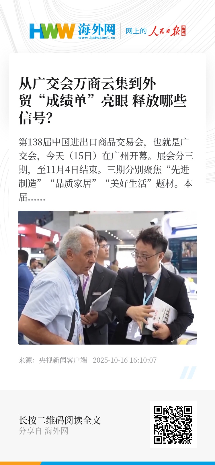还有就是全球供应链韧性持续增强。前三季度我们能够看到民营企业成为稳外贸的主力,而广交会上中小企业通过集群效应和政策扶持,积极参与国际竞争,也巩固了中国在全球供应链中的枢纽地位。应该说广交会的繁荣还有外贸的亮眼表现,它既是中国经济韧性的缩影,也是全球贸易格局重构的见证。