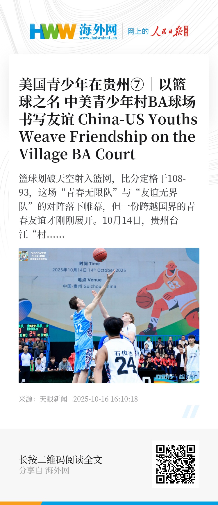 以篮球为媒,以友谊为桥。这场“村BA”友谊赛,早已超越胜负,让美国青少年领略了中国乡村篮球的澎湃活力,也让中国青少年感受到世界篮球的多元魅力。正如凯尔· 斯宾塞(Kyle Spencer)所期望的,这是一次文化的浸润,一次视野的开阔。篮球在空中划出的弧线,连接起大洋两岸的年轻心灵,共同写下关于青春的热爱与未来。(贵州日报天眼新闻记者 王旗 周尧)