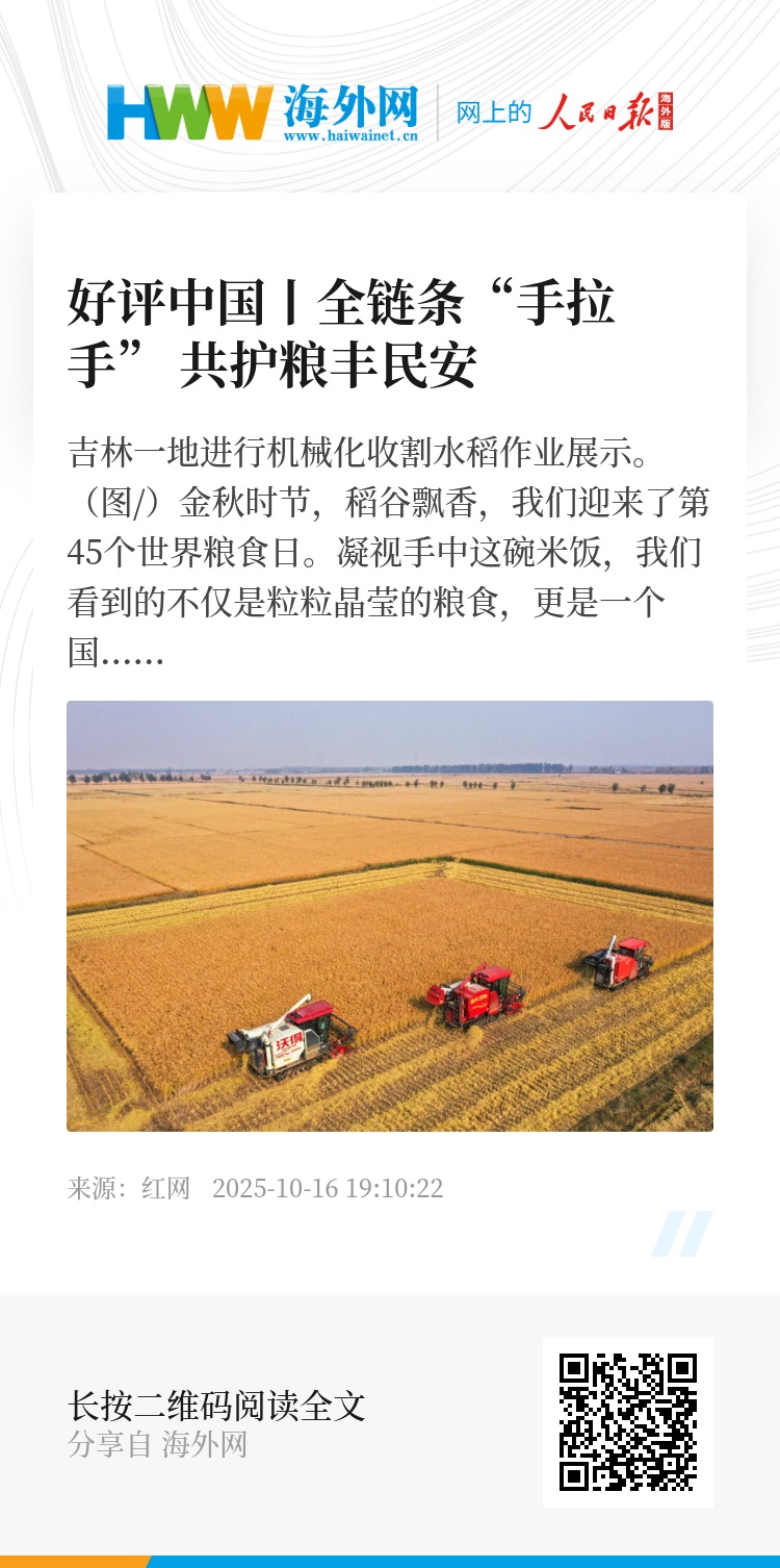 世界粮食日的主题提醒我们,“手拉手共倡多样美食,聚合力同创美好未来”。在这个充满不确定性的时代,守护好大国粮仓,既是对当下人民生活的责任,也是对子孙后代的承诺。让我们从自己做起,从每一餐做起,共同守护这份来之不易的粮食安全,让中国饭碗永远端得稳、端得牢。
