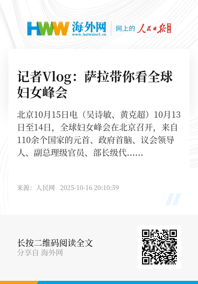 人民网北京10月15日电(吴诗敏、黄克超)10月13日至14日,全球妇女峰会在北京召开,来自110余个国家的元首、政府首脑、议会领导人、副总理级官员、部长级代表、联合国和国际组织负责人、外国驻华使节等出席。人民网外籍专家萨拉走进峰会现场,面对面倾听与会嘉宾的心声。