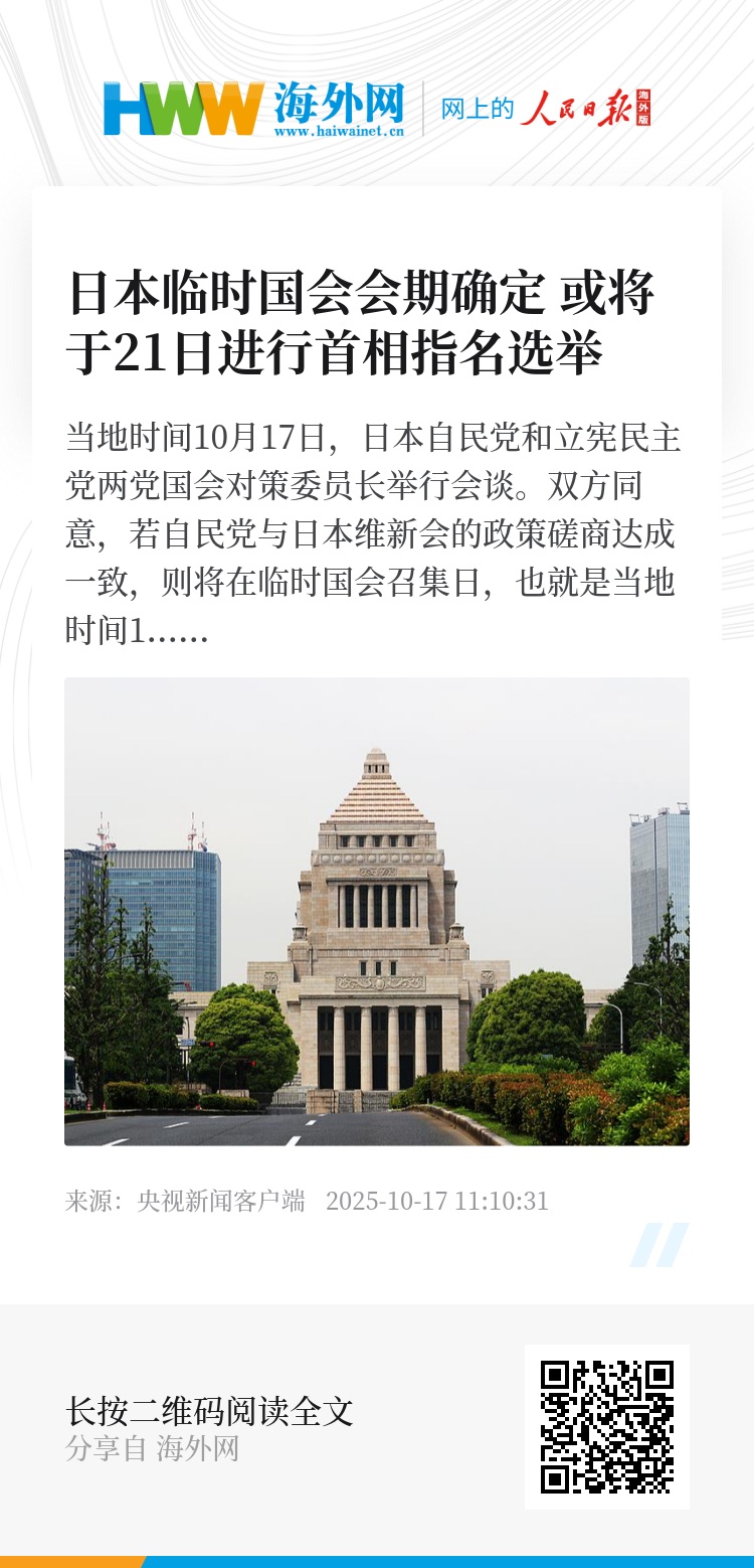 当地时间10月17日,日本自民党和立宪民主党两党国会对策委员长举行会谈。双方同意,若自民党与日本维新会的政策磋商达成一致,则将在临时国会召集日,也就是当地时间10月21日,进行首相指名选举。